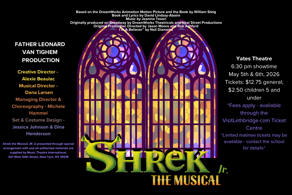 Get ready for a swamp-tacular adventure! Check out the talented junior high performers from Father Leonard Van Tighem School as they bring a beloved fairy tale to life with Shrek the Musical Jr., based on the Oscar-winning DreamWorks film and the Broadway production by Jeanine Tesori and David Lindsay-Abaire.